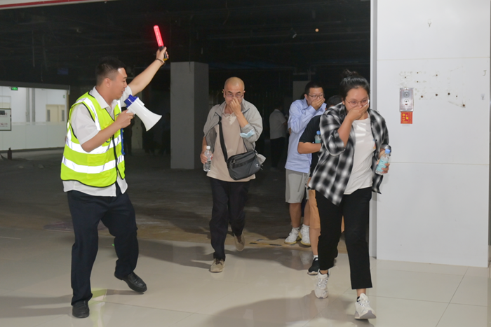 園區(qū)模擬突發(fā)火情。在第一時(shí)間發(fā)現(xiàn)“火情”后,園區(qū)立即啟動(dòng)應(yīng)急預(yù)案,組織撲滅初期火情,組織人員疏散。整個(gè)過(guò)程訓(xùn)練有素,專(zhuān)業(yè)化程度高。