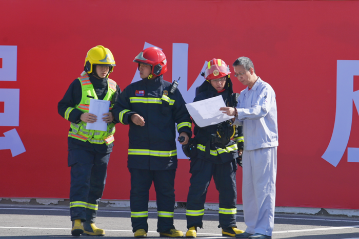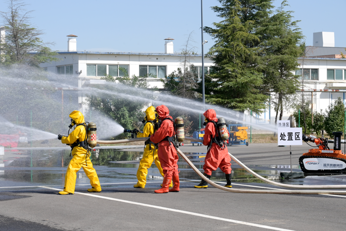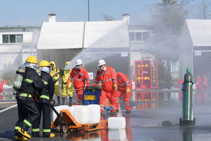 演練緊張而有序,周邊有毒有害氣體濃度監(jiān)測和偵檢、事故現(xiàn)場火災(zāi)撲救、空氣中可燃?xì)怏w和有毒有害氣體濃度稀釋、泄漏危險化學(xué)品輸送管道堵漏……環(huán)環(huán)相扣、環(huán)環(huán)跟進(jìn)。
